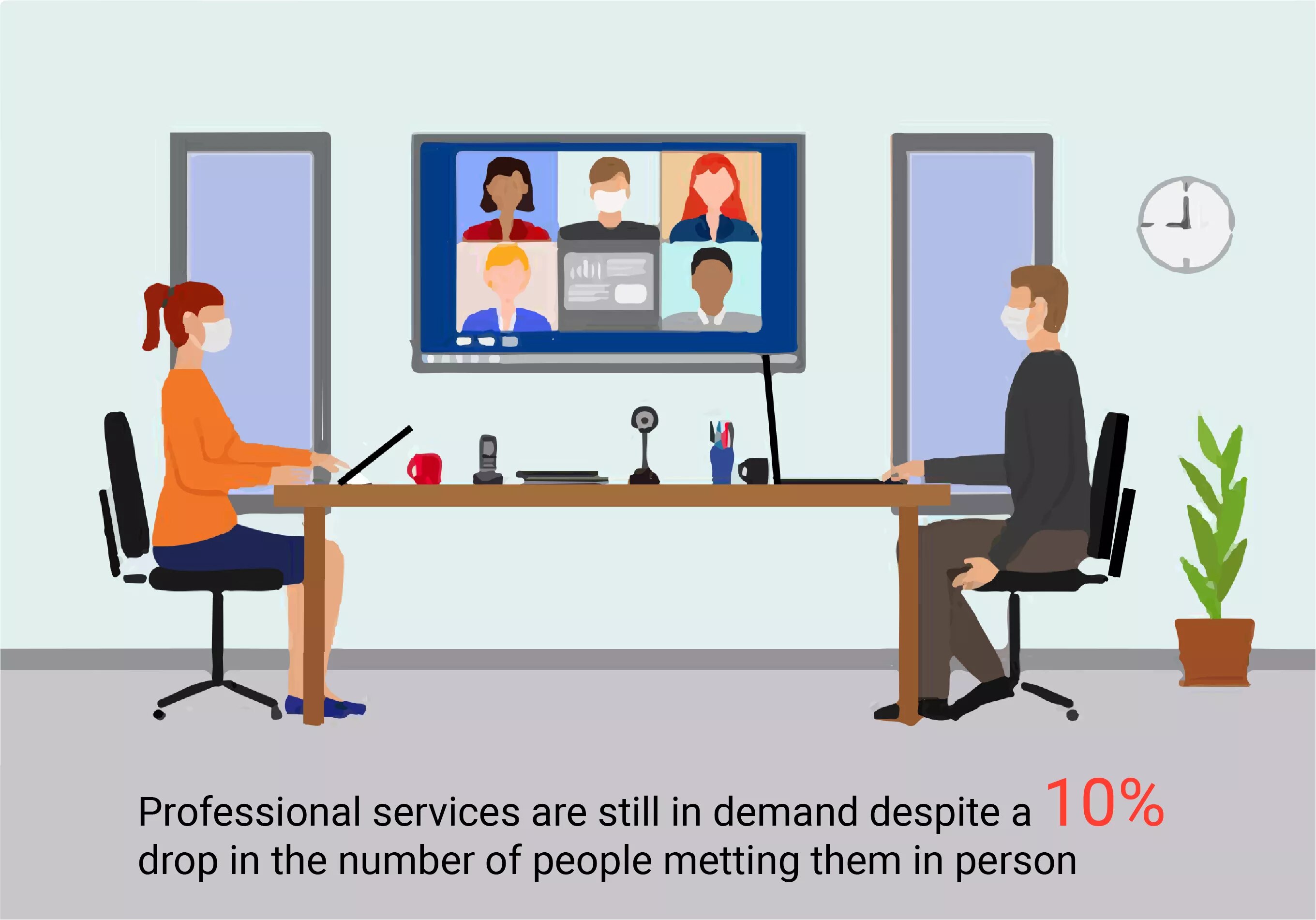 استناداً إلى البيانات التي جمعتها سيرفكورب في دراستنا الأخيرة، يمكننا القول بأنه على الرغم من حدوث انخفاض حاد في عدد العملاء الذين يلتقون بمقدمي الخدمات المهنيين شخصيًا، إلا أنه لا يزال يتم توفير أو الحفاظ على نفس المستوى من الخدمات المهنية. فمن يعملون في الخدمات القانونية والاستشارية والمالية وتكنولوجيا المعلومات ليسوا سوى عدد قليل من المجالات الرئيسية في مشهد الأعمال التي تأثرت بسبب الاتصال المحدود بين المستهلكين والخدمات المهنية.
